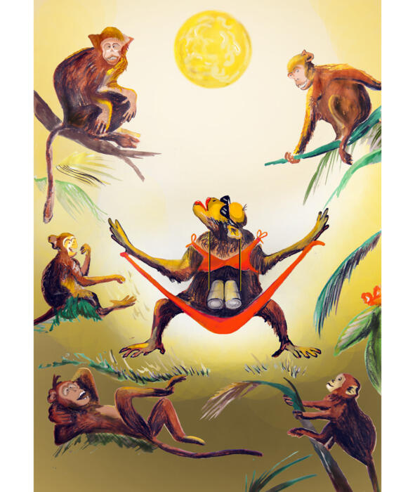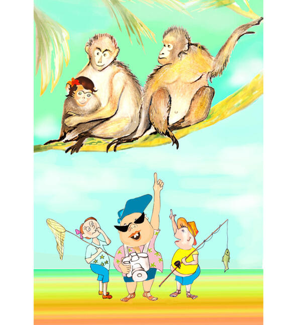 Мартышки рукоплескали вождю, а затем начиналось представление. Ма-Кака надевал на себя что-нибудь из принесённых вещей и тут же принимался пародировать туристов. Вот он полная дама в бикини, что принимает солнечную ванну на пляже; вот он слепой старик, что ищет и не может найти искусственную челюсть. А вот он немощный турист, что пытается влезть на пальму за кокосом.