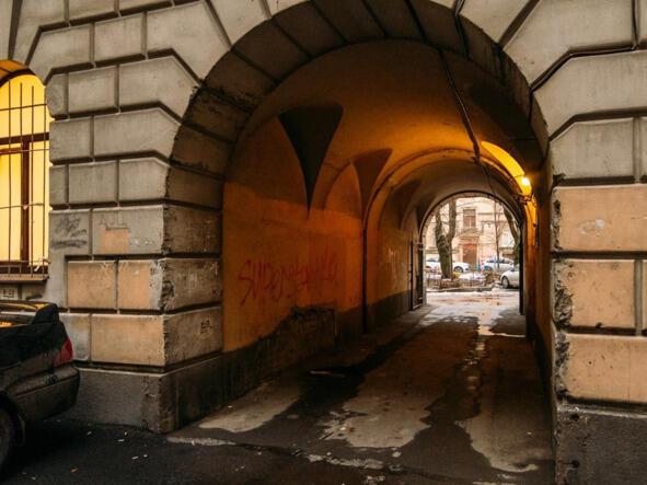 После такого завтрака можно было, взяв самокат, на целый день смыться во двор. В доме 44б двор был очень хороший. Он состоял из трёх дворов: переднего, выходившего на Кировский, среднего двора-колодца и заднего двора. Дворы соединялись друг с другом сводчатыми переходами. Для детворы было полное раздолье.