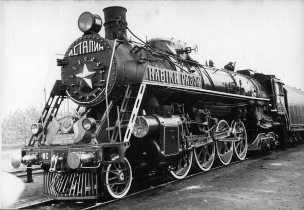 На борту паровоза советский лозунг: «НАВЕКИ ВМЕСТЕ»