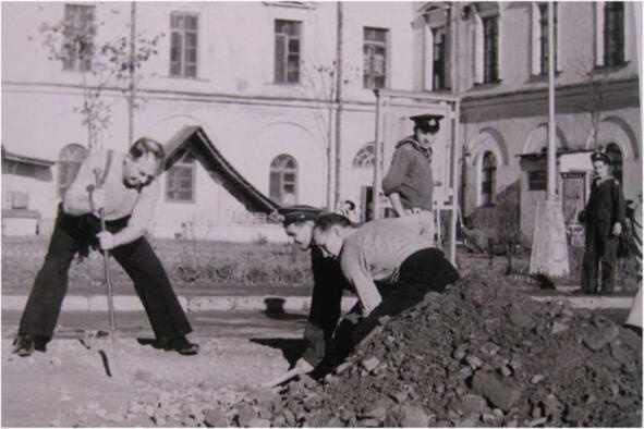 Ленинский воскресник. Начальник училища контр-адмирал П. С. Степанов (преемник Жмакина) работает ломом.