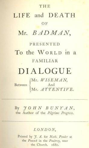 As I was considering with my self, what I had written concerning the Progress of the Pilgrim from this World to Glory; and how it had been acceptable to many in this Nation: It came again into my mind to write, as then, of him that was going to Heaven, so now, of the Life and Death of the Ungodly, and of their travel from this world to Hell. The which in this I have done, and have put it, as thou seest, under the Name and Title of Mr. Badman, a Name very proper for such a Subject: I have also put it into the form of a Dialogue, that I might with more ease to my self, and pleasure to the Reader, perform the work.