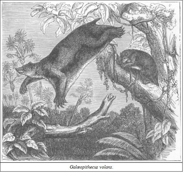 SUB-ORDER PLEUROPTERA.FAMILY GALÆOPITHECIDÆThere is a curious link between the Lemurs and the Bats in the Colugos. (Galæopithecus): their limbs are connected with a membrane as in the Flying Squirrels, by which they can leap and float for a hundred yards on an inclined plane. They are mild, inoffensive animals, subsisting on fruits and leaves. Cuvier places them after the Bats, but they seem properly to link the Lemurs and the frugivorous Bats. As yet they have not been found in India proper, but are common in the Malayan Peninsula, and have been found in Burmah.