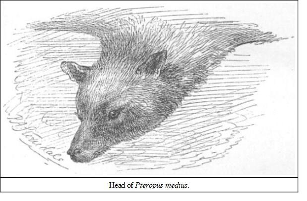 NO. 32. PTEROPUS LESCHENAULTII (CYNONYCTERIS AMPLEXICAUDATA)The Fulvous Fox-Bat (Jerdon's No. 13)Dobson places this bat in the sub-group Cynonycteris. It seems to differ from Pteropus only, as far as I can see, in having a small distinct tail, though the above-quoted author considers it closely allied to the next genus.