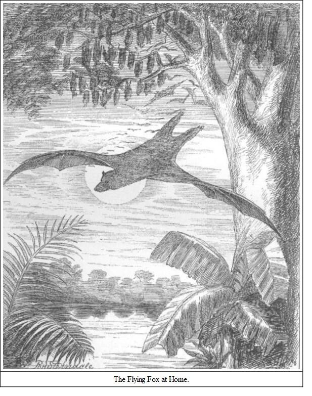 Tickell's account of these colonies is most graphic, though Emerson Tennent has also given a most interesting and correct account of their habits. The former writes:"From the arrival of the first comer until the sun is high above the horizon, a scene of incessant wrangling and contention is enacted among them, as each endeavours to secure a higher and better place, or to eject a neighbour from too close vicinage. In these struggles the bats hook themselves along the branches, scrambling about hand over hand with some speed, biting each other severely, striking out with the long claw of the thumb, shrieking and cackling without intermission. Each new arrival is compelled to fly several times round the tree, being threatened from all points, and, when he eventually hooks on, he has to go through a series of combats, and be probably ejected two or three times before he makes good his tenure." For faithful portraying, no one could improve on this description. These bats are exceeding strong on the wing. I was aware that they went long distances in search of food, but I was not aware of the power they had for sustained flight till the year 1869, when, on my way to England on furlough, I discovered a large flying fox winging his way towards our vessel, which was at that time more than two hundred miles from land. Exhausted, it clung on to the fore-yard arm; and a present of a rupee induced a Lascar to go aloft and seize it, which he did after several attempts. The voracity with which it attacked some plantains showed that it had been for some time deprived of food, probably having been blown off shore by high winds. Hanging head-downwards from its cage, it stuffed the fruit into its cheeks, monkey-fashion, and then seemed to chew it at leisure. When I left the steamer at Suez it remained in the captain's possession, and seemed to be tame and reconciled to its imprisonment, tempered by a surfeit of plantains. In flying over water they frequently dip down to touch the surface. Jerdon was in doubt whether they did this to drink or not, but McMaster feels sure that they do this in order to drink, and that the habit is not peculiar to the Pteropodidæ, as he has noticed other bats doing the same. Colonel Sykes states that he "can personally testify that their flesh is delicate and without disagreeable flavour;" and another colonel of my acquaintance once regaled his friends on some flying fox cutlets, which were pronounced "not bad." Dr. Day accuses these bats of intemperate habits; drinking the toddy from the earthen pots on the cocoanut trees, and flying home intoxicated. The wild almond is a favourite fruit.