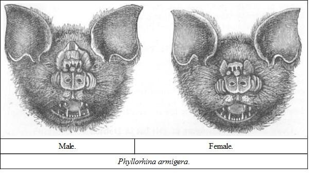 DESCRIPTION.Muzzle short; body short and thick; a transverse frontal leaf with a sac behind it; no folds of skin on each side of the horse-shoe as in the last species; ears large, naked and rounded; colour dusky brown or mouse, sometimes light fawn; wing membrane blackish; interfemoral membrane large, and including the tail all but the tip.