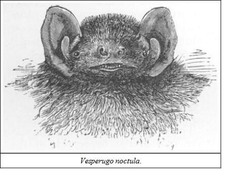 GENUS VESPERUGOBats with very broad and obtuse muzzles; the glandular prominences much developed between the eyes and the nostrils; crown of the head flat; but what distinguishes it from the following genus, Scotophilus, is the presence of four incisors in the upper jaw, whereas Scotophilus has two onlyotherwise the two genera are very similar.