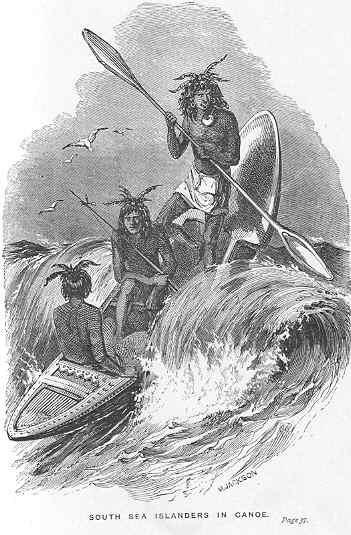 The famous Rob Roy canoe, which is now so much in vogue among boys and young men of aquatic tendency, is constructed and managed on precisely the same principles with the Eskimo kayak; the only difference between the two being that the Rob Roy canoe is made of thin wood instead of skin, and is altogether a more elegant vessel. An account of it will be found in our chapter on Boats. The South Sea islanders also use a canoe which they propel with a double-bladed paddle similar to that of the Eskimos. They are wonderfully expert and fearless in the management of this canoe, as may be seen from the annexed woodcut.
