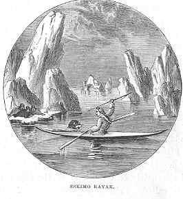 The canoes used by the Eskimos who inhabit the Polar Regions are made of a light framework of wood, which is covered entirely over with seal-skina round hole being left in the centre, in which the Eskimo sits. Round this hole there is a loose piece of skin, which is drawn up by the man and fastened round his waist. The machine is thus completely water-tight. No waves can dash into, although they can sweep over it; and if by chance it should upset, the Eskimo can turn it and himself up into the proper position by one dexterous sweep of his long, double-bladed paddle. The paddle, which varies from ten to fifteen feet, is simply a pole with a blade at each end. It is grasped in the centre, and each end dipped alternately on either side of the kayak, as this canoe is called. Eskimo kayaks are first-rate sea-boats. They can face almost any sort of weather. They are extremely light, and are propelled by the natives very swiftly. In these frail canoes the natives of the Polar Regions pursue seals and whales, and even venture to attack the walrus in his native element. The kayak is used exclusively by the men. The oomiak, or womens canoe, is of much larger and clumsier construction, somewhat like a boat. It is open above, and can hold a large family of women and children. Like the kayak, it is a framework of wood covered with seal-skin, and is propelled by means of short paddles of the spoon form.