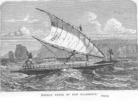 One of these double canoes is thus described by Cheever in his Island World of the Pacific:A double canoe is composed of two single ones of the same size placed parallel to each other, three or four feet apart, and secured in their places by four or five pieces of wood, curved just in the shape of a bit-stock. These are lashed to both canoes with the strongest cinet, made of cocoa-nut fibre, so as to make the two almost as much one as same of the double ferry-boats that ply between Brooklyn and New York. A flattened arch is thus made by the bow-like cross-pieces over the space between the canoes, upon which a board or a couple of stout poles laid lengthwise constitute an elevated platform for passengers and freight, while those who paddle and steer sit in the bodies of the canoes at the sides. A slender mast, which may be unstepped in a minute, rises from about the centre of this platform, to give support to a very simple sail, now universally made of white cotton cloth, but formerly of mats.