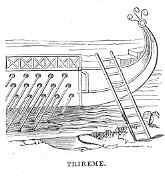 The ships of the ancient Greeks and Romans were divided into various classes, according to the number of ranks or banks, that is, rows, of oars. Monoremes contained one bank of oars; biremes, two banks; triremes, three; quadriremes, four; quinqueremes, five; and so on. But the two latter were seldom used, being unwieldy, and the oars in the upper rank almost unmanageable from their great length and weight.