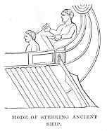 The sails used in these ships were usually square; and when there was more than one mast, that nearest the stern was the largest. The rigging was of the simplest description, consisting sometimes of only two ropes from the mast to the bow and stern. There was usually a deck at the bow and stern, but never in the centre of the vessel. Steering was managed by means of a huge broad oar, sometimes a couple, at the stern. A formidable beak was affixed to the fore-part of the ships of war, with which the crew charged the enemy. The vessels were painted black, with red ornaments on the bows; to which latter Homer is supposed to refer when he writes of red-cheeked ships.