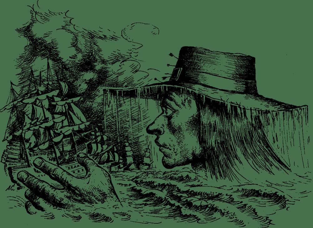 Империя Блефуску находится на острове, расположенном на северо-восток от Лилипутии и отделенном от нее проливом шириною в восемьсот ярдов. Я еще не видел острова; узнав же о предполагаемом нашествии, старался не показываться на этой стороне берега из опасения быть замеченным с кораблей неприятеля, который не имел никаких сведений о моем присутствии, так как во время войны всякое сношение между двумя империями было запрещено под страхом смертной казни и наш император наложил эмбарго на выход какого бы то ни было судна из гаваней. Я сообщил его величеству составленный мною план захвата всего неприятельского флота, который, как мы узнали от наших разведчиков, стоял на рейде, готовый сняться с якоря при первом попутном ветре. Я осведомился у самых опытных моряков относительно глубины пролива, часто ими измерявшейся, и они сообщили мне, что при самой высокой воде эта глубина в средней части пролива равняется семидесяти глюмглеффам, что составляет около шести европейских футов, во всех же остальных местах она не превышает пятидесяти глюмглеффов. Я отправился на северо-восточный берег, откуда видна империя Блефуску, спрятался за бугорком и направил свою подзорную трубку на стоявший на якоре неприятельский флот, в котором насчитал до пятидесяти боевых кораблей и большое число транспортов. Возвратившись домой, я приказал (получив на то полномочие) доставить мне канат покрепче и известное количество возможно толстых железных брусьев. Мне привезли канат толщиною в обыкновенную бечевку и брусья величиной в нашу вязальную спицу. Чтобы придать этому канату большую прочность, я сплел его втрое и с тою же целью скрутил вместе по три железных бруска, загнув их концы в виде крючков. Прикрепив пятьдесят таких крючков к такому же числу веревок, я возвратился на северо-восточный берег и, сняв с себя кафтан, башмаки и чулки, в кожаной куртке вошел в воду за полчаса до прилива. Сначала я быстро пошел вброд, а у середины проплыл около тридцати ярдов, пока снова не почувствовал под собою дно. Таким образом, меньше чем через полчаса я достиг флота. Увидя меня, неприятели пришли в такой ужас, что, как лягушки, попрыгали с кораблей и поплыли к берегу, где их собралось не менее тридцати тысяч. Тогда, вынув свои снасти и зацепив нос каждого корабля крючком, я связал все веревки в один узел. Во время этой работы неприятель осыпал меня тучей стрел, и многие из них вонзились мне в руки и лицо. Помимо ужасной боли, они сильно мешали работе. Более всего я боялся за свои глаза и, наверно, лишился бы их, если бы не придумал тотчас же средства для защиты. Среди других необходимых мне мелочей у меня сохранились очки, которые я держал в секретном кармане, не замеченном, как я уже говорил выше, императорскими сыщиками. Я надел очки и крепко привязал их. Вооружась таким образом, я смело продолжал работу, несмотря на стрелы неприятеля, которые хотя и попадали в стекла очков, но не причиняли им особого вреда. Приладив все крючки и взяв узел в руку, я начал тащить; однако ни один корабль не тронулся с места, потому что все они крепко держались на якорях. Таким образом, мне оставалось совершить самую опасную часть моего предприятия. Я выпустил веревки и, оставя крючки в кораблях, смело обрезал ножом якорные канаты, причем более двухсот стрел угодило мне в лицо и руки. После этого я сх