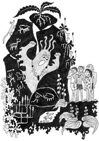 Ещё считалось обязательным перед дорогой вознести моления Великому и Ужасному Уа-Уаху, духу-покровителю племени. Он жил в отдельной расщелине, богато расписанной углём и охрой. Тут тебе и охотники нападают на медведя, и женщины пляшут вокруг огня, и три мамонта пасутся над рекой, и Ма Ша собирает ракушки для Уа-Уаха, и юный саблезубый тигр Мы Ша с цветочком в левом ухе улыбается и машет лапой. Мы Ша приходил посмотреть на свой портрет, остался доволен, но попросил удлинить хвост. Хвост удлинили.