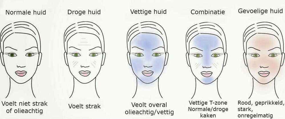 Schoonheidsspecialisten stellen 5 hoofdtypes van de huid vast: normaal, droog, vettig/olieachtig, combinatie en gevoelig. Het verschil tussen de ene type van het ander is afhankelijk van de afscheiding intensiteit van huidsmeer bij een hoeveel talgklieren, en op welke zone van het gezicht die het meest actief is. Wat ook van belang is, is het vermogen van de huid om hydratatie op te nemen en te behouden.