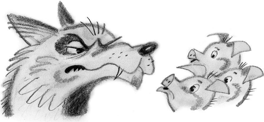 One night, the big bad wolf, who dearly loved to eat fat little piggies, came along and saw the first little pig in his new house of straw. The wolf knocked on the door and said, Let me in, let me in, little pig, or Ill huff and Ill puff[85] and Ill blow your house in![86]