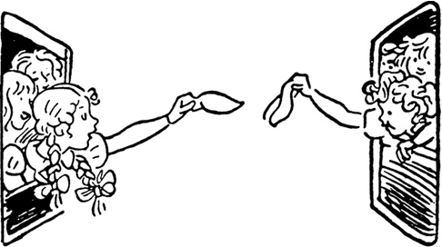Frau Muthesius plant ein kleines Abschiedsfest. Der Vater eines der Mädchen, dem ein Kaufhaus gehört, hat eine große Kiste Lampions, Girlanden und viele andere Dinge geschickt. Nun sind die Helferinnen und die Kinder eifrig dabei, die Veranda und den Garten schön zu schmücken. Sie schleppen Küchenleitern von Baum zu Baum, hängen bunte Laternen ins Laub, schlingen Girlanden von Zweig zu Zweig und bereiten auf einem langen Tisch eine Tombola vor. Andere schreiben auf kleine Zettel Losnummern. Der Hauptgewinn: ein Paar Rollschuhe! Wo sind eigentlich die Locken und die Zöpfe?, fragt Fräulein Ulrike. (So nennt man neuerdings47 Luise und Lotte.)