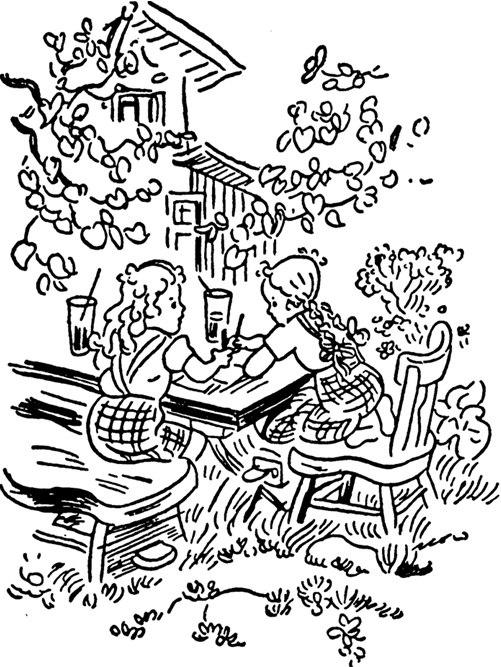 Die Zwillinge sitzen nicht irgendwo im Gras, sondern im Garten. Sie halten sich auch nicht an den Händen dazu haben sie keine Zeit , sondern haben Heftchen vor sich liegen, halten Bleistifte in der Hand, und im Augenblick diktiert Lotte gerade der emsig kritzelnden Luise: Am liebsten mag Mutti Nudelsuppe mit Rindfleisch. Das Rindfleisch holst du beim Metzger Huber.