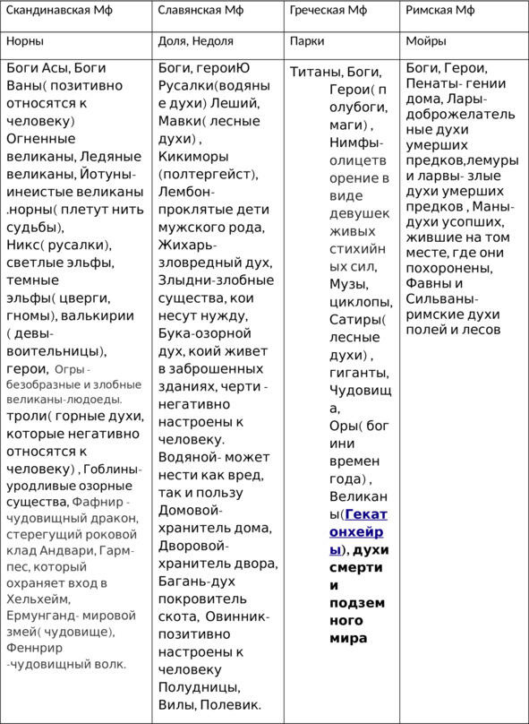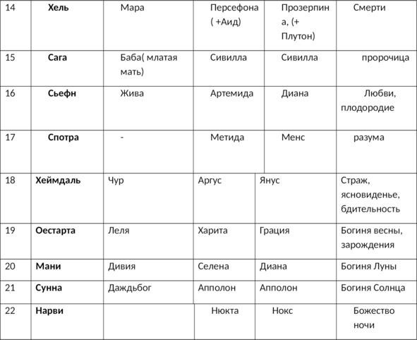 Не все колонки заполнены, ибо есмь божества что ипостасей не имеют точных средь сих 3 религий. А есть и где повторяются, то от того что схожи очень и на одного бога и на иного. Но не тем ни иным не являются. Здесь не все божества, но самые основные.