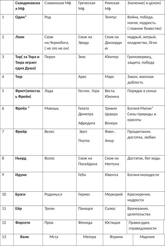 Маски везде таяться, истина кривдой скрывается, болотной тиной прячется. То дабы вразуметь ее надобно головушкой пораскинуть, ибо подле вопроса всегда ответ рядом исходится. Многие из божеств скандинавских ипостась некой силы, что во иных религиях аль местах обитания иные ипостаси и имянаречения имеют. Ибо одна Душа играет, в разных религиях, на разных ипостасях. А шаблоны (2 астральное тело, се облик, яко у покойников на могилах) сами люди создают. То они создают, а Душа может войти в шаблон сей да и поиграть. А часто такое что в религии многобожной одна Душа по 2, а то и 3 бога играет. А сие связано с разными направленностями. Ибо, вот Фригг- богиня семейного очага, и любви. А Фрея-богиня магии природы и войны. Се потому что Душа сия разные стороны имеет. То она и любить может, и воевать, и к природе близка. Фригг- узкую специальность имеет, а Фрея- се мультиструктура. Но Душа за них играет одна и та же.