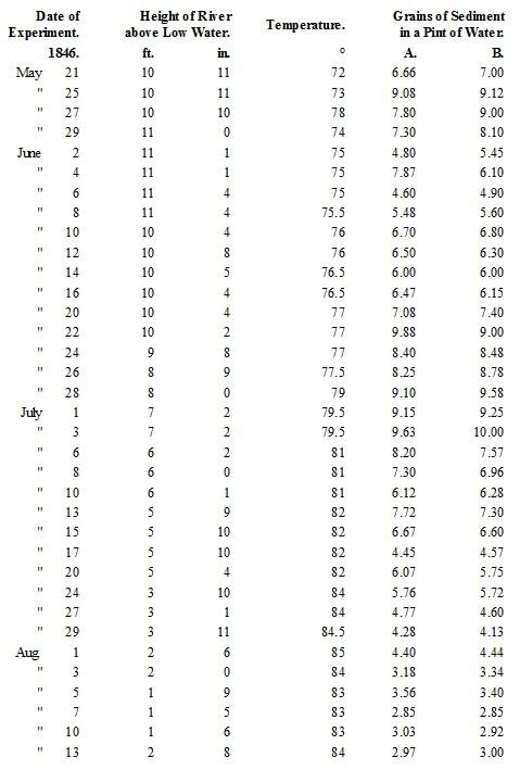 Table showing the Quantity of Sediment contained in the Water of the Mississippi RiverThe mean average of column A. is 6.32.