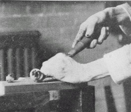In sharpening an outside bevel gouge, the main bevel is obtained on the grindstone, care being taken to keep the gouge rocking on its axis, so as to get an even curve. It is then whetted on the flat side of a slipstone, Fig. 83, the bevel already obtained on the grindstone being made slightly more obtuse at the edge. A good method is to rock the gouge on its axis with the left hand, while the slipstone held in the right hand is rubbed back and forth on the edge. Then the concave side is rubbed on the round edge of the slipstone, care being taken to avoid putting a bevel on it. Inside bevel gouges need to be ground on a carborundum or other revolving stone having a round edge. The outfit of the agacite grinder, (Fig. 224, p. 120), contains one of these stones. The whetting, of course, is the reverse of that on the outside bevel gouge.