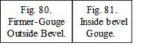 The gouge is a form of chisel, the blade of which is concave, and hence the edge curved. When the bevel is on the outside, the common form, it is called an outside bevel gouge or simply a "gouge," Fig. 80; if the bevel is on the inside, it is called an inside bevel, or inside ground, or scribing-gouge, or paring-gouge, Fig. 81.6