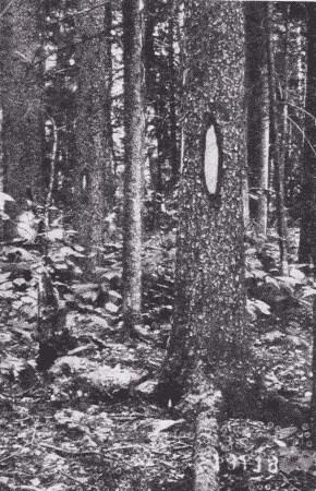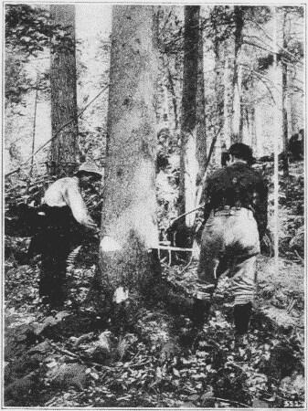 Preliminary to the actual logging are certain necessary steps. First of all is landlooking. This includes the survey of the forest land for the purpose of locating good timber. Fig. 1. Most of the woodland has previously been roughly surveyed by the government and maps made indicating which parts are private land and which are still held by the government. The boundaries of townships, sections, quarter sections, eighties, forties, etc., are indicated by "blazes" on trees, Fig. 2, so that the "cruiser" or "looker" as he goes thru the woods can identify them with those on his oil paper map. The cruiser also studies the kinds and character of the trees, the contour of the ground, the proximity to streams,all with the view to marketing the product. Acting on the information thus gained by the cruiser, the lumberman purchases his sections at the proper land office, or if he is less scrupulous, buys only enough to serve as a basis for operations. Enormous fortunes have been made by timber thieves, now respectable members of the community. As a further preliminary step to lumbering itself, the tote road and camp are built. The tote road is a rough road on which supplies for crew and cattle can be taken to camp from civilization.