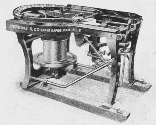 Fig. 51. Combination Lath-Binder and Trimmer. With this machine the operator can trim the bundles of lath simply by tilting the packing frame over from him causing the bundles to pass between the saws, thereby trimming both ends at one movement.