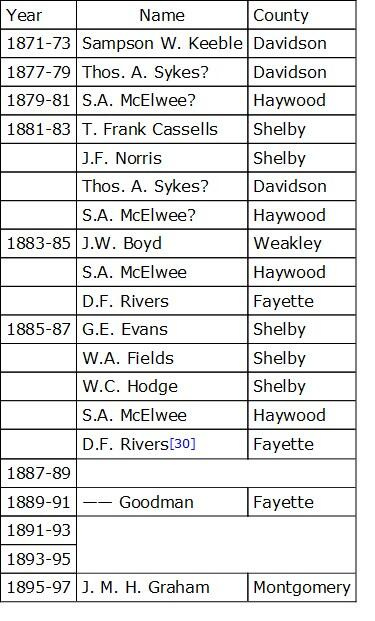 Davidson county, Tennessee, sent two colored men to the Legislature. The first colored member of the Legislature was Sampson W. Keeble from 71-73. From 77-79 the colored member was Thomas A. Sykes. Both of these were representatives. Tennessee never had any colored senators. Sampson W. Keeble was a native of Tennessee. Thomas A. Sykes was a native of North Carolina and had been a member of the North Carolina legislature.176