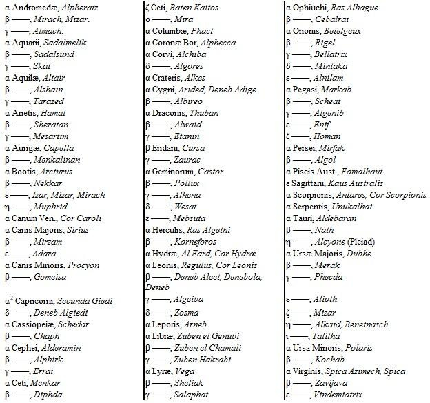 The following table exhibits the names of all the stars of the first three magnitudes to which astronomers have given names; at least, all those whose names are in common use: