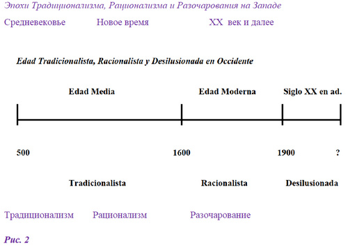 Несколько поколений образуют Исторический Момент. Несколько исторических моментов образуют период. Несколько периодов Эпоху. Согласно Ортеге-и-Гассету, мы можем выделить три эпохи внутри каждой цивилизации: Эпоху Традиционализма, Эпоху Рационализма и Эпоху Разочарования.