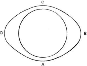 The first question then is, as to how these two opposite heaps of water are placed in respect to the position of the moon. The most obvious explanation would seem to be, that the moon should pull the waters up into a heap directly underneath it, and that therefore there should be high water underneath the moon. As to the other side, the presence of a high tide there was, on this theory, to be accounted for by the fact that the moon pulled the earth away from the waters on the more remote side, just as it pulled the waters away from the more remote earth on the side underneath the moon. It is, however, certainly not the case that the high tide is situated in the simple position that this law would indicate, and which we have represented in Fig. 1, where the circular body is the earth, the ocean surrounding which is distorted by the action of the tides.