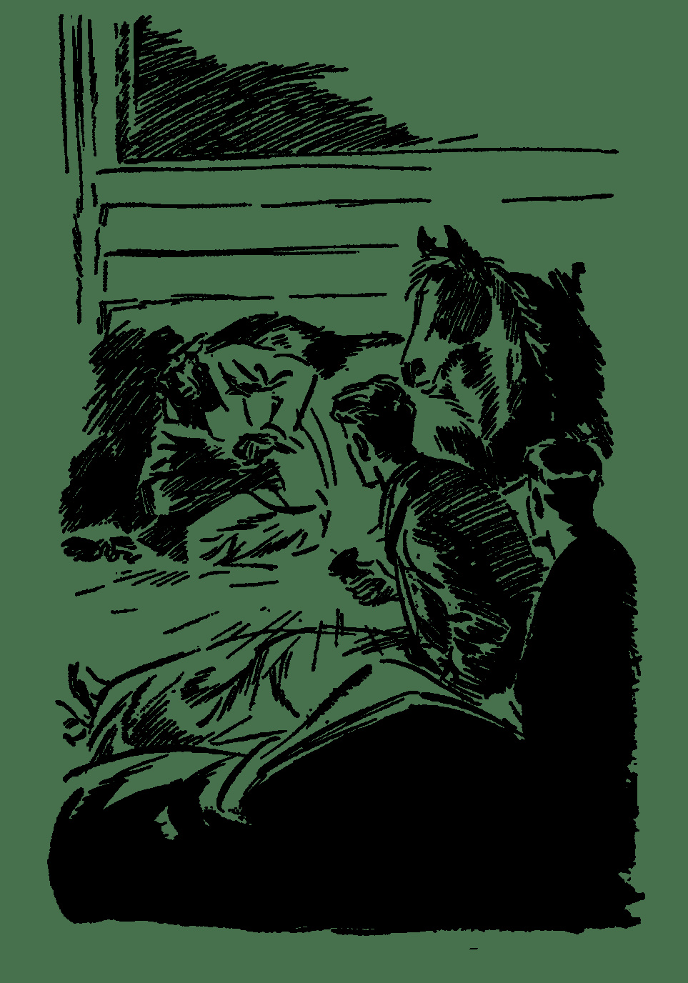 Фонарь нашёлся, Джулиан зажёг его. Сперва он ничего не увидел цыган закатился в стойло и спрятался за Стригунком. Но вот свет упал на него.