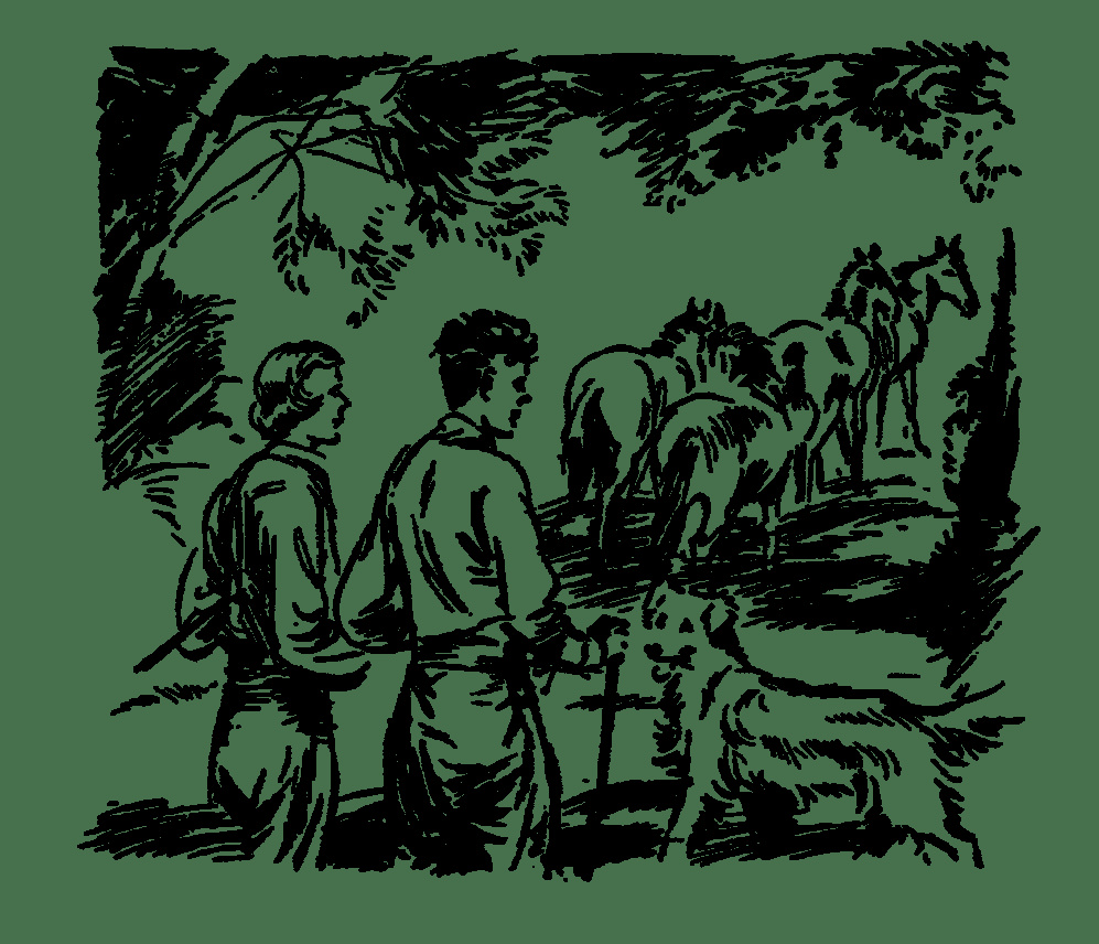 Они двинулись в путь с четырьмя лохматыми пони: Тимми следовал за ними по пятам. В конюшне он был дельным помощником, особенно если какую-то лошадь нужно было поймать.