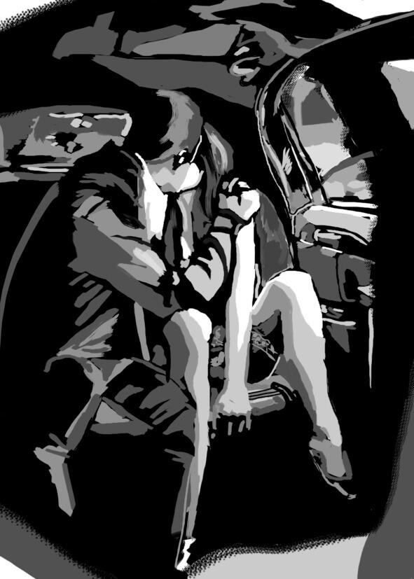 Na velikem parkirišču ni bilo mnogo vozil, niti žive duše ni bilo videti. Viktorjev avtomobil je bil parkiran v kotu, skrit v modro vijolični temi. Ilonine roke ni izpustil iz svojih toplih dlani, neprestano jo je poljubljal in šepetal: