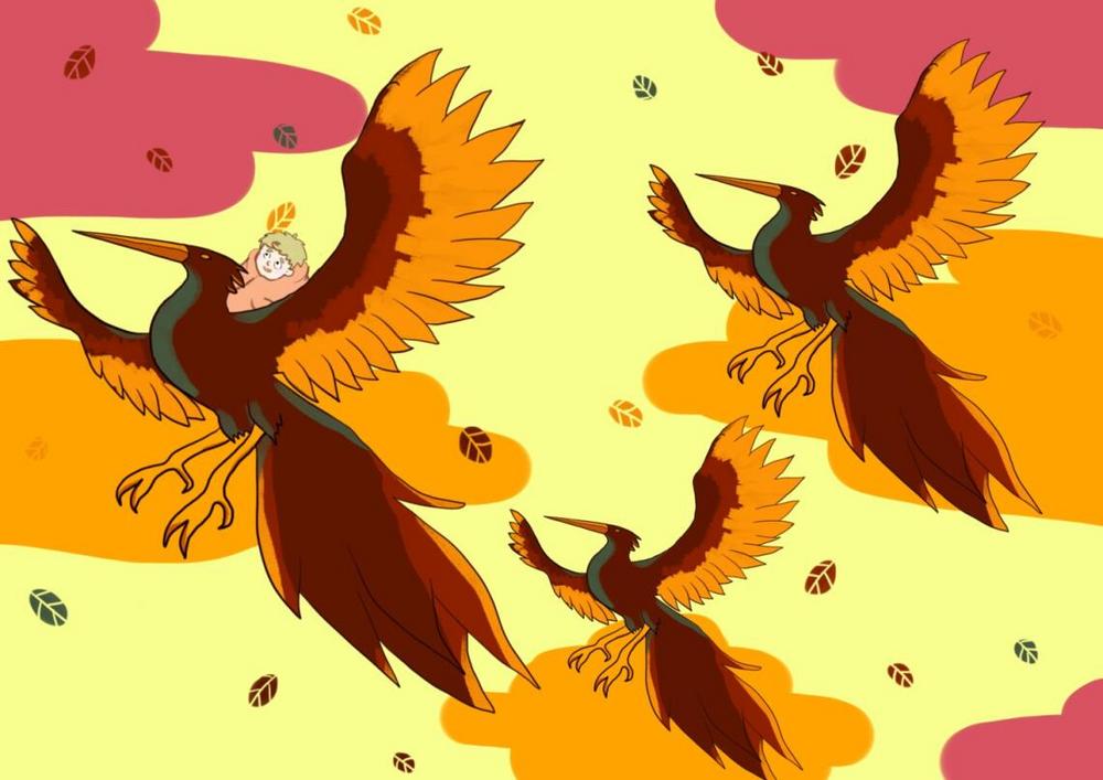 Птицы осторожно подошли к мальчику и сильно взмахнули огромными белыми крыльями. Две из них положили Гришу на спину третьей подружки. Птичья стая вместе с мальчиком взмыла высоко в синее небо. Две птицы летели по бокам, а третья, у которой на спине в мягких перьях, как в гнезде, с удовольствием лежал Гриша, летела посередине. Они пролетали над голубыми и синими, зелёными и дымчато-воздушными красками, похожими на небо, леса и море.