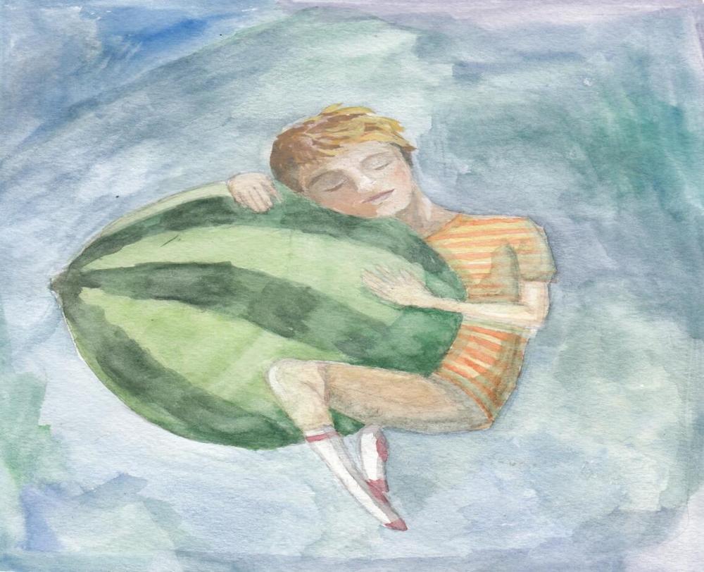 Голубые краски в небе дули свежим легким ветерком, и мальчик высунул голову из перьев, чтобы посмотреть на землю. Ему казалось, что он дышит воздухом из облаков и пьёт капли воды, которые падали с неба и утоляли его жажду. Ему показалось, что он видит на земле арбузы Сверху весело подмигивали своими яркими глазками звёздочки. Перья птиц стали приобретать нежный голубой цвет, окрашиваясь красками неба и моря..