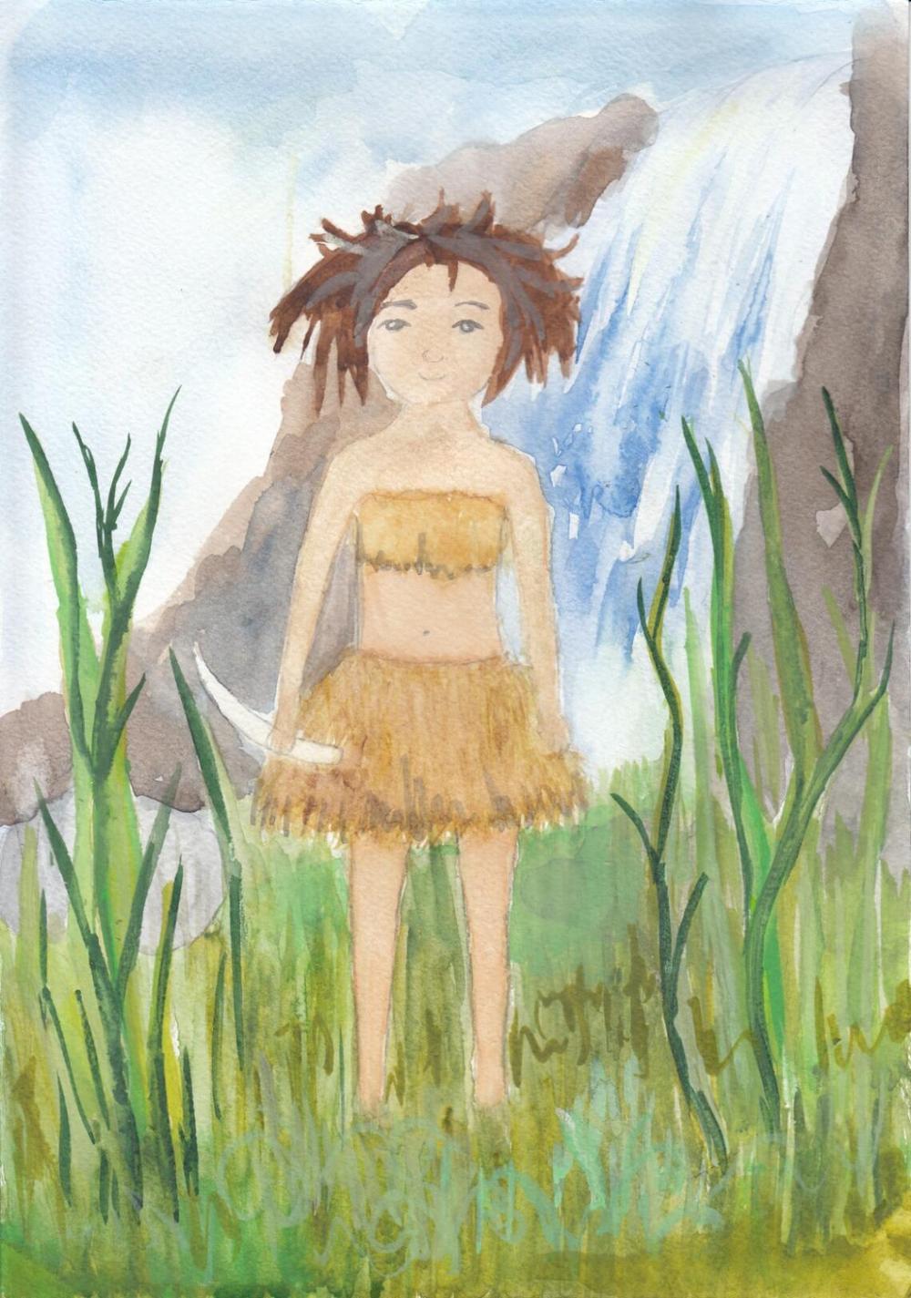 В стороне стояла маленькая, как он сам, девочка. Она показалась ему очень красивой. Она тоже была почти голая! На ней не было красивой юбочки или платьица, как на девочках, с которыми он ходил в детский сад. Только на животике висела высохшая желтая трава. Волосы торчали у неё дыбом, сбившись, как у собак шерсть в комок, и стояла она на земле босая. Но глазки у неё были ярко-зелёные, красненький ротик с белоснежными зубами улыбался ему. В руках она держала не то палку, не то кость, и такую огромную, каких Гриша еще не видывал. В кастрюле такая кость ни за что бы не уместилась!