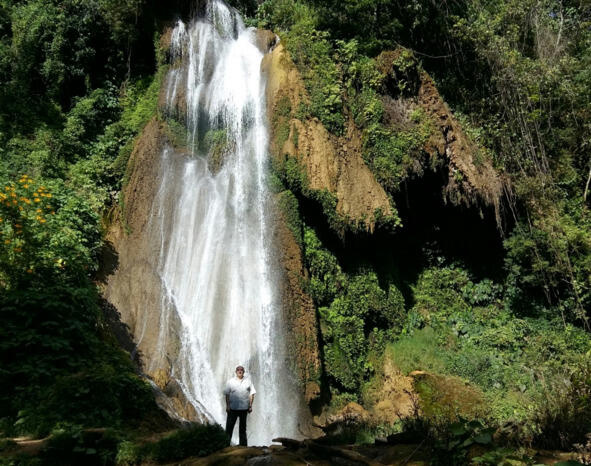 Наконец, расширилось внутреннее пространство, и мы увидели гигантские сталактиты, свисающие откуда-то сверху. И свет из провала в земле. Двигаться нормально мне мешала раненая нога. Где-то порезал ступню. И теперь из-под носка медленно сочилась теплая липкая кровь наконец, мы выбрались из пещеры и через несколько десятков метров оказались перед гигантским красивейшим горным водопадом в лесу. Ощущение фантастическое. Продолжив путь, пришлось многократно перебираться по скользкому бревну через бурную реку то к одному берегу, то к другому.
