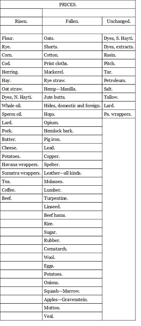 From these tables it is obvious that there has been, in the first place, no general rise of prices such as was confidently predicted by the panic-mongers of last year. On the contrary, the large majority of prices show a downward tendency. But more important than this is the fact made obvious by these tables that the price of the protected product has not risen. The foreign goods have advanced in some instances and been shut out in consequence, but domestic goods have taken their places, the price being kept down by domestic competition. In a word these tables prove that except for the enormous reduction in the cost of sugar, the new tariff has had but slight effect if any on the course of prices of the necessaries of life, and that the statements of the free traders as to a general rise of prices was entirely false.