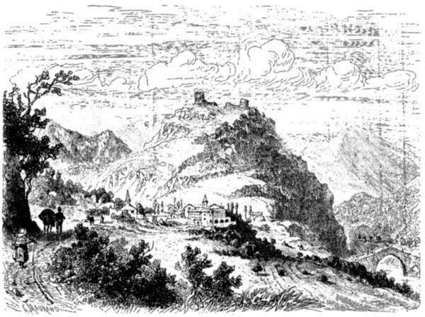 Sainte-Croix et les ruines du Château de Quint.Dessin de Karl Girardet d'après M. A. Muston.