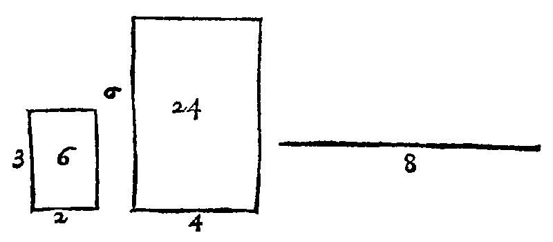 Out of the similitude of figures two consectaries doe arise, in part only, as is their axiome, rationall and expressable by numbers. If three right lines be continually proportionall, it shall be as the first is unto the third: So the rectilineall figure made upon the first, shall be unto the rectilineall figure made upon the second, alike and likelily situate. This may in some part be conceived and understood by numbers. As for example, Let the lines given, be 2. foot, 4. foote, and 8 foote. And upon the first and second, let there be made like figures, of 6. foote and 24. foote; So I meane, that 2. and 4. be the bases of them. Here as 2. the first line, is unto 8. the third line: So is 6. the first figure, unto 24. the second figure, as here thou seest.