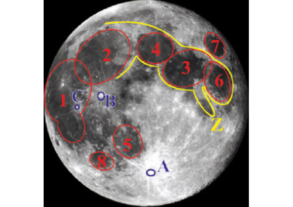 Dla miłośników bezpośrednich obserwacji przestrzeni. Najważniejsze formacje na powierzchni księżyca, które są wyraźnie widoczne przez lornetkę. Z podświetlone na żółto zgodnie z chińską mitologią «Lunar Rabbit». A krater Tycho (na cześć astronoma Tycho Brahe). B Krater Kopernik, C Krater Kepler. Ponadto: 1 Ocean burz, 2 Morze deszczów, 3 Morze spokoju, 4 Morze jasności, 5 Morze chmur, 6 Morze obfitości, 7 Morze kryzysów, 8 Morze wilgotności. Niektórzy obserwatorzy uważają, że kontury mórz księżycowych bardzo przypominają kontury ziemskich kontynentów.