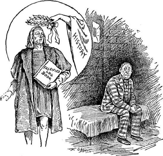 In falsifying the log-book in order to make his sailors believe that they had not sailed so far as they had, Columbus did a wrong act, unworthy of his high notions regarding the pious discovery of this land. The artist has shown here not only one of the most faithful portraits of Columbus and his crooked log-book, but the punishment which he should have received.