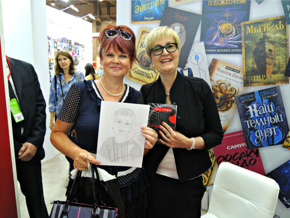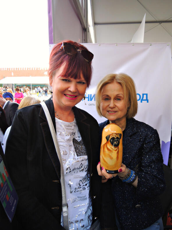 С Дарьей Донцовой, писательницей иронических детективов, на Книжном Фестивале в Москве на Красной площади. Матрёшку-мопса она вручила мне за рассказ, который занял I место в её группе ВК.