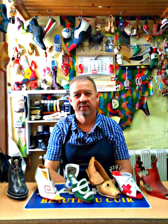 Сапожных дел мастер в окружении своих работ.
