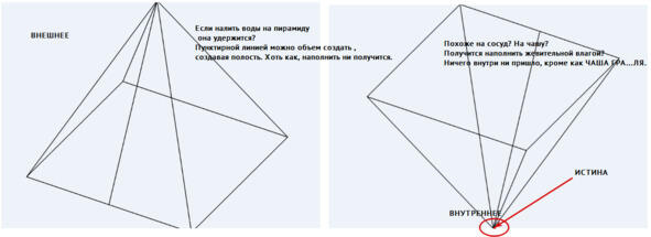 В тот момент когда организуется внутри четыре стороны ВНУТРИ (образно), их нет возможности потрогать, увидеть. Появляется ОТСУТСТВИЕ всех этих состояний, как и памяти о них. Проявляется пятый элемент. ЦЕНТ, ЖИЗНЬ в ИСТИНЕ и с ИСТИНОЙ. Ум видит состояние пирамиды, так и рисует его себе в воображении. Так и есть. Её видно, но суть открывается если одномоментно видеть её перевёрнутой. Снаружи, как внутри и наоборот. Просто ЖИЗНЬ.