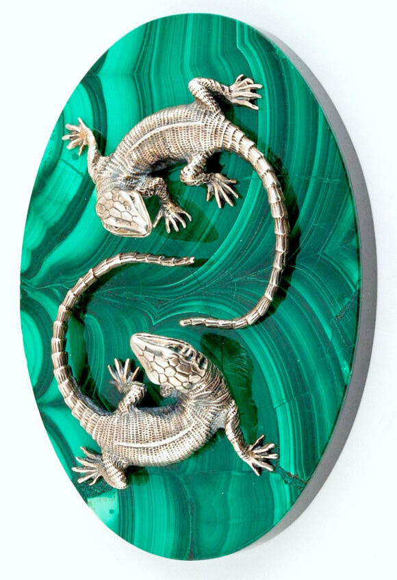 «И опять похлопала в ладошки, и все ящерки разбежались. Сама тоже на ноги вскочила, прихватилась рукой за камень, подскочила и тоже, как ящерка, побежала по камню-то. Вместо рук-ног лапы у ее зеленые стали, хвост высунулся, по хребтине до половины черная полоска, а голова человечья«Бажов Павел Петрович. (18791950) «Медной горы хозяйка.»