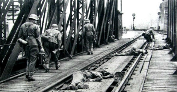 В 4 часа на мосту появились штурмовые отряды. Оборону здесь держали пограничники под командованием лейтенанта Нечаева. Как только немцы пересекли белую черту границы, бойцы открыли огонь. Гитлеровцы откатились.