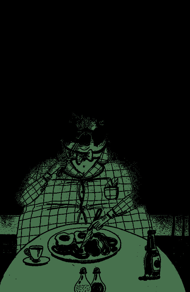 Бельмар был крупным мужчиной с такими выпученными глазами, что казалось, будто они вот-вот вылезут из орбит. Клетчатый костюм ядовито-зелёного цвета сидел на нём скверно. На затылке, как всегда, торчала шляпа с узкими загнутыми полями. Уписывая еду за обе щёки, он слышал, как хозяйка гостиницы разговаривала с кем-то в кухне.